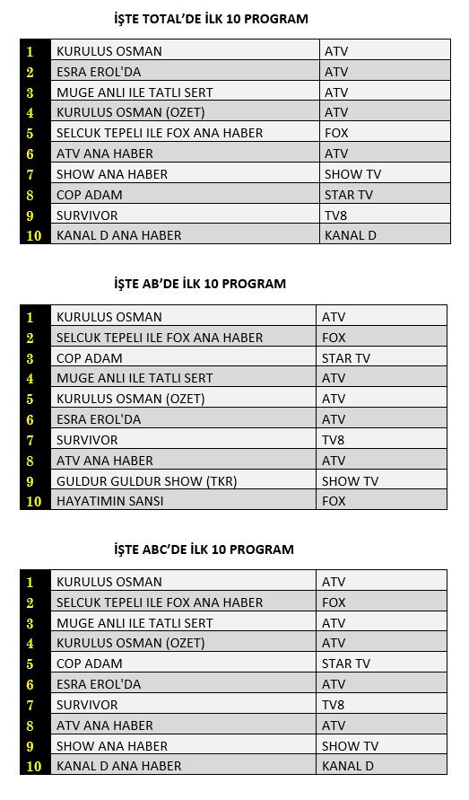 Not: TİAK'ın aldığı karar nedeniyle reyting sonuçlarının detaylarını ve ilk 100 program sıralamasını yayınlayamıyoruz.
