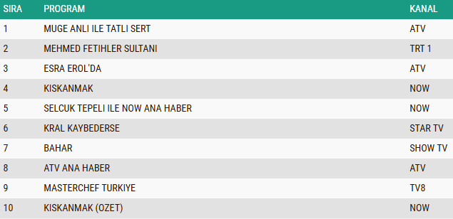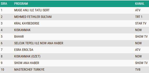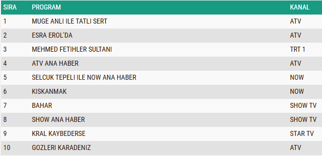 TRT 1'in iddialı tarihi dizisi "Mehmed: Fetihler Sultanı" ise üçüncü sıraya yerleşerek güçlü yapımlar arasındaki yerini korudu. Haber bültenleri cephesinde ATV Ana Haber, Show TV Ana Haber ve Selçuk Tepeli ile NOW Ana Haber izleyicinin ilgisini çekerken, dizilerde de büyük bir rekabet yaşandı. "Kıskanmak", "Bahar", "Kral Kaybederse" ve "Gözleri Karadeniz" gibi yapımlar yüksek izlenme oranlarıyla gecenin öne çıkan diğer yapımları arasında yer aldı.