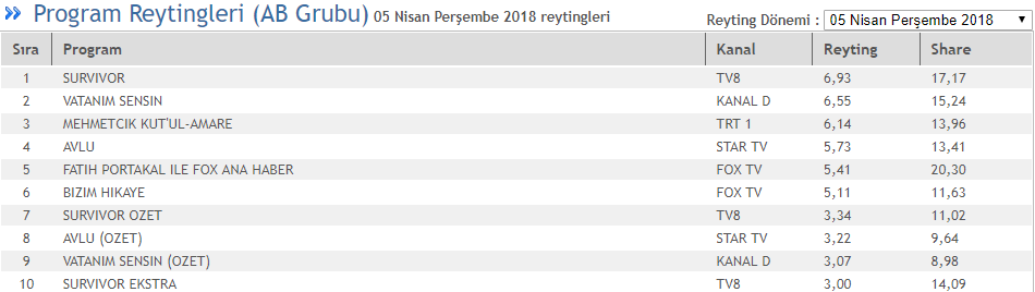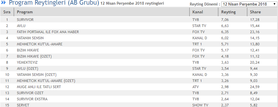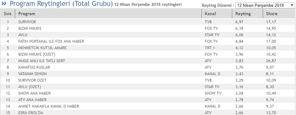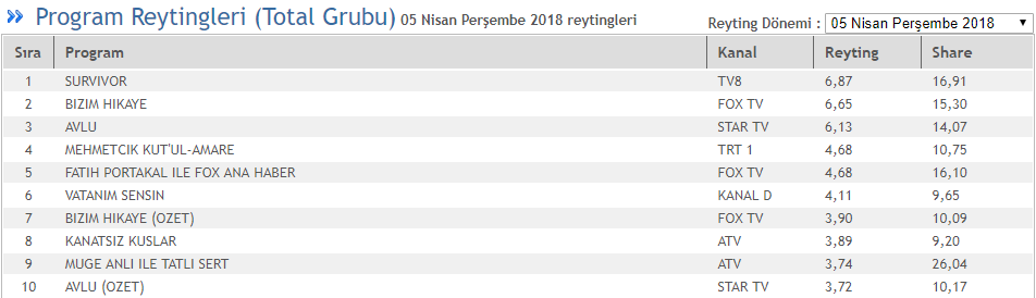 Geçtiğimiz hafta TOTAL reyting grubunda en çok izlenen program 6,87 reyting 16,91 share oranıyla TV8'de yayınlanan Survivor olmuştu. İkinci sırada 6,65 reyting, 15,30 share oranıyla Fox TV'nin sevilen dizisi Bizim Hikaye yer alırken, Star TV'nin yeni başarılı dizisi Avlu'da 6,13 reyting, 14,07 share oranıyla üçüncü sırada yer almıştı.