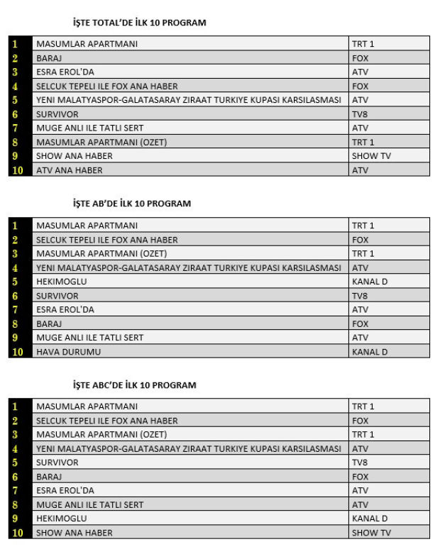 ABC'de de günü birinci sırada tamamlayan program 'Masumlar Apartmanı' oldu. Dizi böylece haftayı tüm kategorilerde birinci bitirerek önemli bir başarıya imza attı. 'Selçuk Tepeli ile Fox Ana Haber' ikinci, 'Masumlar Apartmanı Özet' üçüncü, 'Yenimalatyaspor - Galatasaray' dörüncü, 'Survivor' beşinci sırada günü tamamladı.