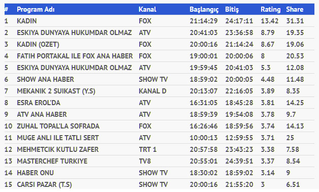 13 Kasım Salı Reyting Sonuçları