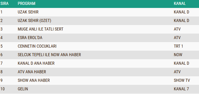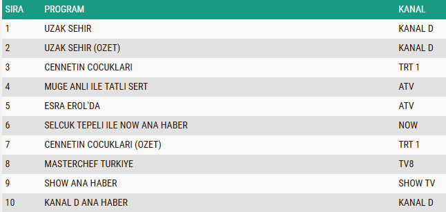 Her hafta olduğu gibi yine geniş kitleleri ekran başına toplayan Uzak Şehir dizisi, Total kategorisinde günün en çok izlenen yapımı olarak zirvedeki yerini korudu. Üstelik başarı bununla da sınırlı kalmadı: AB ve ABC1 gruplarında da liderliği kimseye kaptırmayarak üç kategoride birden birinci olmayı başardı.