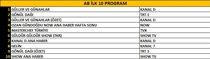 AB izleyici grubunda da reyting sıralaması dikkatleri üzerine çekti. Yeni sezonda ekrana gelen “Güller ve Günahlar” isimli sevilen dizi, yayınlanan bölümüyle AB kategorisinde birinci sıraya yerleşerek güçlü bir performans sergiledi. Altı sezondur izleyiciyle buluşan ve sadık bir kitleye sahip olan “Gönül Dağı” dizisi ise istikrarlı izlenme oranlarıyla ikinci sırada yer aldı. “Güller ve Günahlar” dizisinin tekrar bölümü de gördüğü ilgi sayesinde listede üçüncü basamakta kendine yer buldu.
