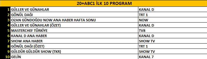 ABC1 izleyici grubunda da gecenin en çok izlenen yapımı “Güller ve Günahlar” isimli dizi oldu. Yeni bölümüyle ekranlara gelen dizi, ABC1 kategorisinde birinci sıraya yerleşerek zirvedeki yerini korudu. Uzun süredir yayın hayatını sürdüren ve geniş bir izleyici kitlesine sahip olan “Gönül Dağı” dizisi, istikrarlı performansıyla ikinci sırada yer aldı. Günün öne çıkan haber bültenlerinden “Ozan Gündoğdu ile NOW Ana Haber Hafta Sonu” ise ABC1 listesinde üçüncü basamakta kendine yer buldu.
