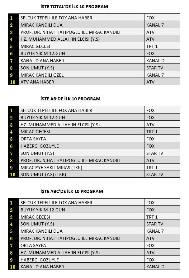 Türkiye’yi kaosa sürükleyen depremlerin üzerinden 12 gün geçti ve televizyonlar normal yayın akışlarına dönmeye başladı. Miraç Kandilinin damga vurduğu 17 Şubat Cuma günü yayınlanan programların reyting sonuçları açıklandı. Selçuk Tepeli ile Fox Haber’in liste başı olduğu Total'de 2..sırada Kanal 7’de ekrana gelen “Miraç Kandili Dua” programı, 3.sırada Atv’de yayınlanan “Prof. Dr. Nihat Hatipoğlu İle Miraç Kandili” yer aldı.