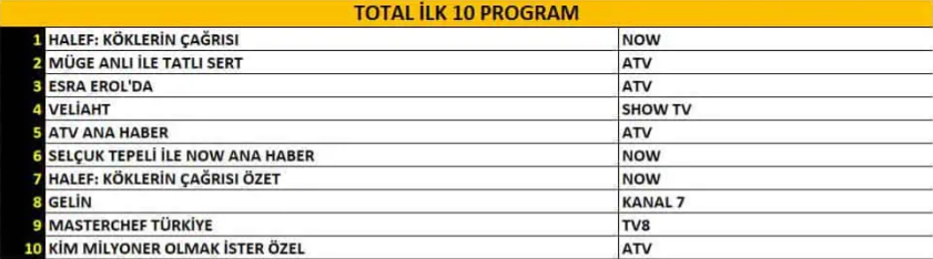 Total kategorisindeki bu tablo, izleyici ilgisinin hem dramatik yapımlara hem de gerçek yaşam temelli programlara dengeli biçimde dağıldığını gösteriyor. “Halef: Köklerin Çağrısı”nın yüksek tempolu hikâyesi özellikle prime-time kuşağında rakiplerini zorlayan bir başarı yakalarken, gündüz programlarının da sadık izleyici kitlesi sayesinde güçlü varlığını koruduğu dikkat çekiyor.
