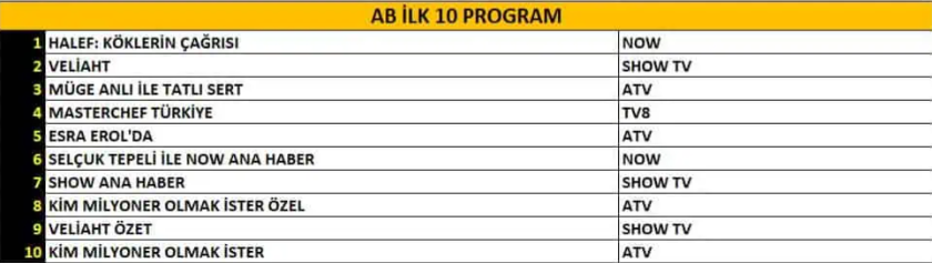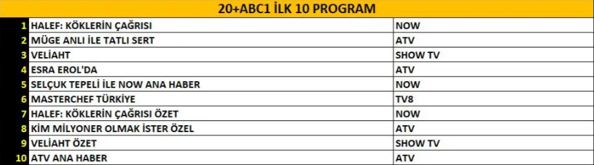 AB izleyici grubunda “Halef: Köklerin Çağrısı” dizisi güçlü anlatımı ve yükselen temposuyla birincilik koltuğunu yine kaptı. Hikâyesi ve oyuncu performanslarıyla dikkatleri üzerine çeken “Veliaht” dizisi ikinci sıraya yerleşirken, gündüz kuşağının uzun soluklu programı “Müge Anlı ile Tatlı Sert” üçüncülükle listeyi tamamladı.
