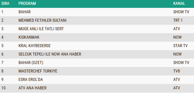 AB seyirci kategorisinde ise zirvenin sahibi, Show TV ekranlarında ilgiyle izlenen ve güçlü bir kadının hayata karşı verdiği direnişi etkileyici bir dille ekranlara yansıtan "Bahar" dizisi oldu. Bir kadının isterse neleri başarabileceğini izleyicisine gösteren dizi, hem senaryosuyla hem de başarılı oyuncu kadrosuyla seyirciden tam not alarak reyting listelerinde birinci sıraya yerleşmeyi başardı.