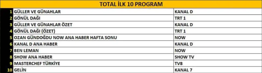 Total reyting grubunda günün zirvesi Kanal D’nin sevilen dizisi “Güller ve Günahlar” dizisi oldu. Hemen ardından, TRT 1’in uzun süredir ilgiyle takip edilen yapımı “Gönül Dağı” ikinci sıraya yerleşti. “Güller ve Günahlar”ın özet bölümü ise yüksek izlenme oranıyla üçüncülüğü alarak dikkat çekici bir başarıya imza attı.