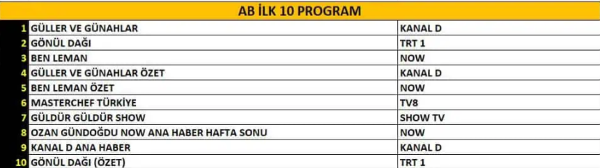 AB reyting kategorisinde gecenin lideri “Güller ve Günahlar” dizisi oldu. Hikâyesi ve oyunculuklarıyla dikkatleri üzerine çeken dizi, güçlü performansıyla birinciliği kimseye bırakmadı. Onu, her bölümüyle aile sıcaklığını ekrana taşıyan “Gönül Dağı” dizisi ikinci sırada takip etti. Üçüncü sıraya ise son dönemlerde adından sıkça söz ettiren yapım “Ben Leman” yerleşti.