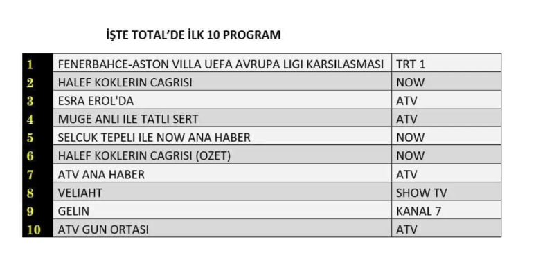 22 Ocak 2026 Perşembe gününe ait reyting verileri kamuoyuyla paylaşıldı. Total izleyici grubunda futbolseverlerin büyük ilgi gösterdiği “Fenerbahçe-Aston Villa UEFA Avrupa Ligi Karşılaşması”, yüksek izlenme oranlarıyla gecenin en çok izlenen yayını olarak zirveye yerleşti. Akşam kuşağında dikkatleri üzerine çeken yapımlardan “Halef: Köklerin Çağrısı” isimli dizi, elde ettiği reytinglerle ikinci sıranın sahibi olurken, gündüz kuşağının istikrarlı programı “Esra Erol’da” ise Total kategorisinde üçüncü sırada yer alarak günün en çok izlenen yapımları arasına girmeyi başardı.