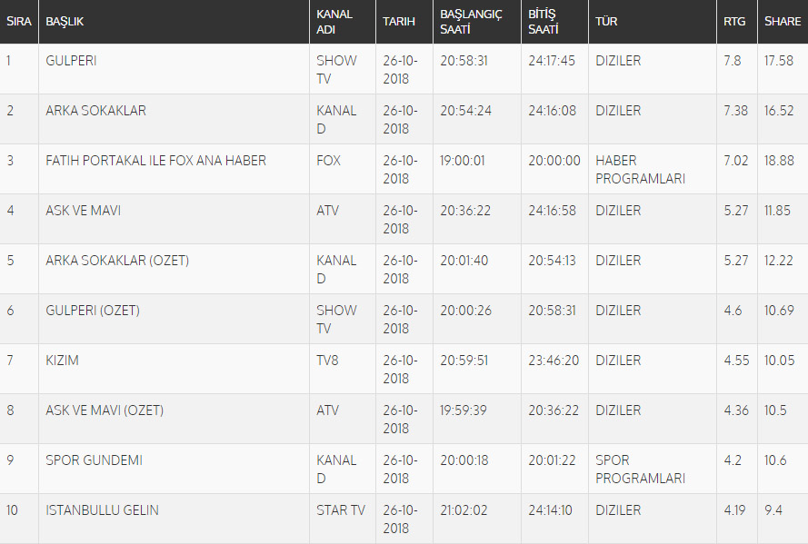 Ölçümlenen TOTAL reytinglerine göre dün en çok izlenen yapım Show TV'nin yeni dizisi Gülperi oldu. Gülperi dizisi 7,80 rating oranla birinci sırada yer alırken, Kanal D'nin fenomen dizisi Arka Sokaklar 7,38 rating oranıyla ikinci, Fatih Portakal ile Fox Ana Haber 7,02 rating oranıyla üçüncü, Aşk ve Mavi dizisi 5,27 rating oranıyla dördüncü, Arka Sokaklar'ın tekrar bölümü 5,27 izlenme oranıyla beşinci sırada konumlandı.