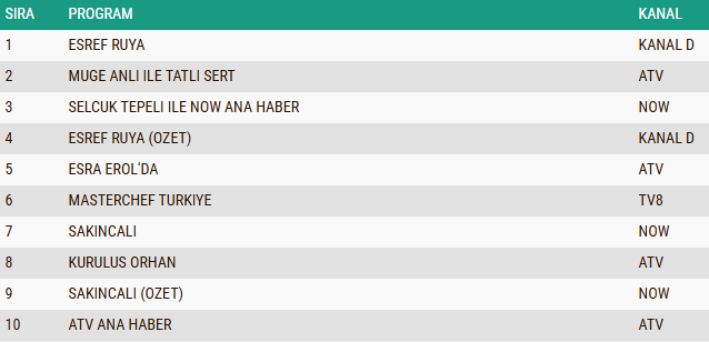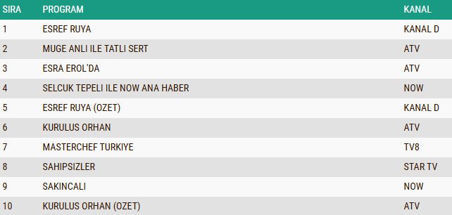 Total kategorisinde reytinglerin zirvesine “Eşref Rüya” dizisi yerleşerek günün en çok izlenen yapımı olmayı başardı. Yapım, özellikle dramatik sahneleri ve güçlü oyunculuklarıyla geniş bir izleyici kitlesini ekran başında tuttu.