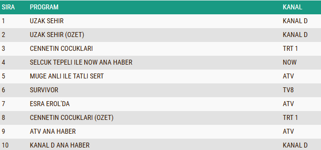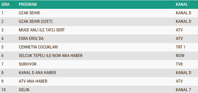 ABC1 izleyici grubunda günün reyting sonuçlarına göre, iki sezondur ekranlarda izleyiciyle buluşan ve istikrarlı başarısını sürdüren başarılı dizi “Uzak Şehir” listenin ilk sırasında yer alarak zirvedeki konumunu korudu. Dizinin özet bölümü “Uzak Şehir (Özet)” yüksek izlenme oranıyla ikinci sıraya yerleşirken, duygusal hikâyesi ve etkileyici anlatımıyla dikkatleri üzerine çeken dizi “Cennetin Çocukları” ise ABC kategorisinde üçüncü sırada kendine yer buldu.