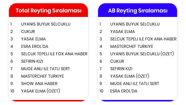 Zirveyi yakından takip eden ve nefes kesen yeni bölümüyle ekrana gelen "Çukur" günü ikinci sırada tamamlarken, haftanın en çok merak edilen konusunun yanıt bulduğu "Yasak Elma" günü üçüncü sırada tamamladı.Total izleyicisinin tercihi değişmedi. Haftalardır zirveyi sahiplenen TRT dizisi "Uyanış Büyük Selçuklu" bu hafta da aynı başarıyı gösterip günü birinci sırada tamamlayan yapım oldu.