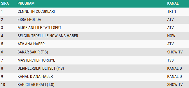 29 Aralık 2025 Pazartesi gününe ait reyting sonuçları belli oldu. Total grubunda izleyicinin en çok tercih ettiği yapım “Cennetin Çocukları” dizisi oldu ve akşamın zirvesine yerleşti. Gündüz kuşağının istikrarlı programlarından “Esra Erol’da” güçlü izlenme oranlarıyla ikinci sırayı alırken, yıllardır ekranlardaki başarısını sürdüren “Müge Anlı ile Tatlı Sert” sabah programı ise üçüncü sırada kendine yer buldu. Açıklanan bu tablo, hem prime time hem de gündüz kuşağında izleyici ilgisinin yüksek seyrettiğini bir kez daha göstermiş oldu.