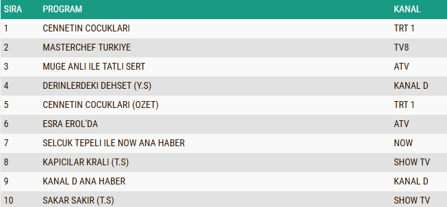 29 Aralık 2025 Pazartesi gününün AB reyting grubunda da dikkat çekici bir sıralama ortaya çıktı. Akşam kuşağında yayınlanan “Cennetin Çocukları” dizisi, bu kategoride de en çok izlenen yapım olarak ilk sıraya yerleşti ve başarısını sürdürdü. Yarışma formatıyla geniş bir izleyici kitlesine ulaşan “MasterChef Türkiye”, istikrarlı performansıyla ikinci sırada kendine yer buldu. Uzun yıllardır gündüz kuşağının vazgeçilmezleri arasında yer alan “Müge Anlı ile Tatlı Sert” programı ise güçlü izlenme oranlarıyla üçüncü sırayı aldı.