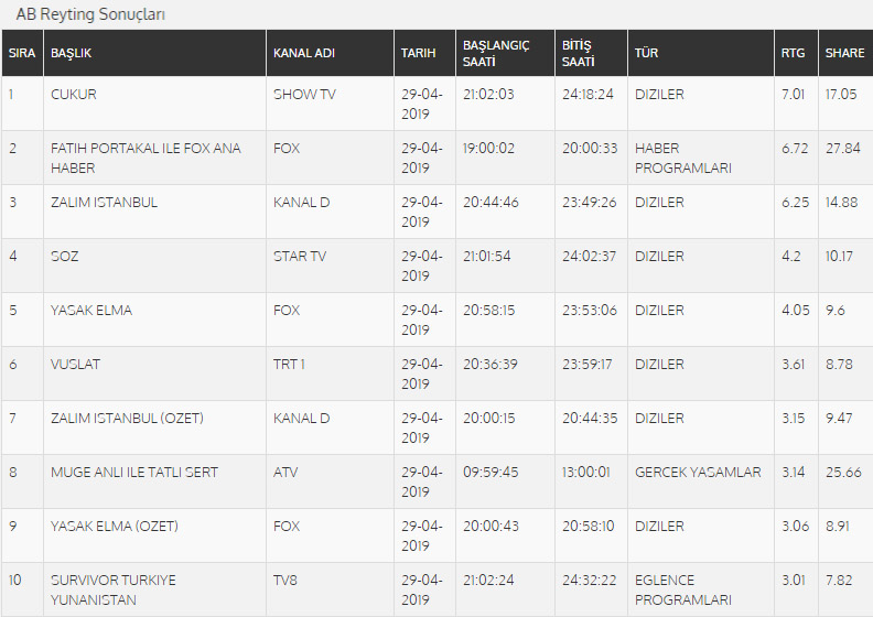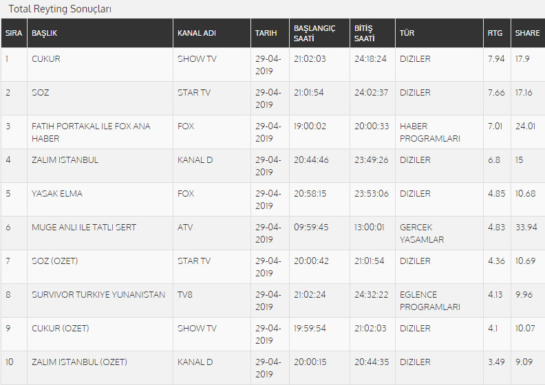 29 Nisan Pazartesi Reyting Sonuçları