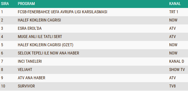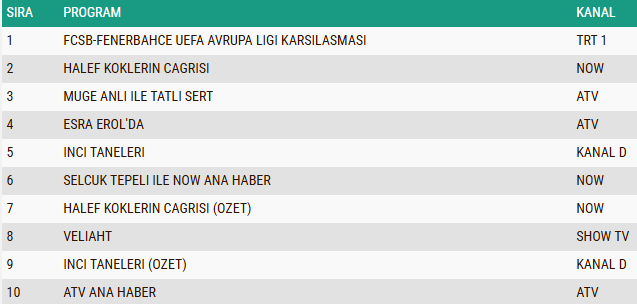 AB izleyici grubunda da 29 Ocak 2026 Perşembe akşamının en çok izlenen yapımı değişmedi ve UEFA Avrupa Ligi kapsamında oynanan FCSB – Fenerbahçe karşılaşması, futbolseverlerin yoğun ilgisiyle listenin zirvesine yerleşti. Gecenin ikinci sırasında, dramatik yapısı ve sürükleyici kurgusuyla dikkatleri üzerine çeken “Halef Köklerin Çağrısı” isimli dizi yer alarak güçlü bir izlenme performansı sergilerken, duygu yüklü sahneleriyle ön plana çıkan “İnci Taneleri” dizisi ise yeni sezon ilk bölümüyle AB grubunda üçüncü sırayı alarak günün en çok izlenen yapımları arasında kendine sağlam bir yer edindi.