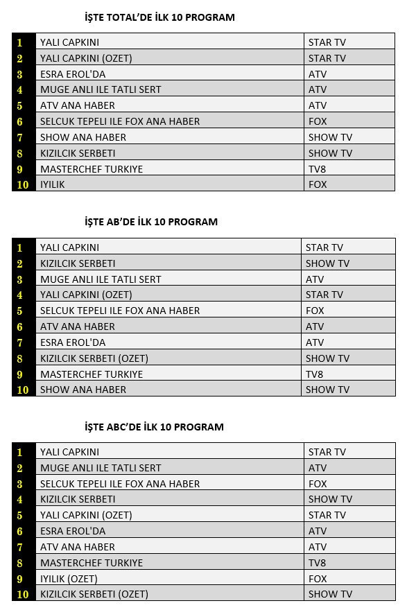 İlk 10 ‘daki diziler; Yalı Çapkını, Kızılcık Şerbeti ve İyilik
