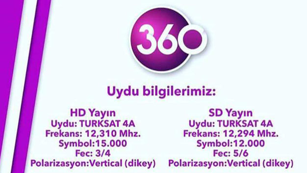 Türksat uydusundan 360 Tv’yi seyredebilmek için gereken frekans bilgileri aşağıdadır.