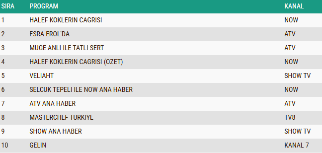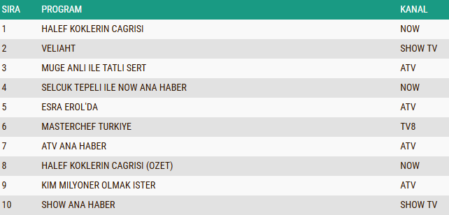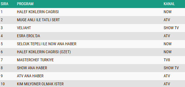 ABC1 kategorisinde “Halef: Köklerin Çağrısı” dizisi birinci sıraya yerleşti. Onu ikinci sırada “Müge Anlı ile Tatlı Sert” gündüz kuşağı programı, üçüncü sırada ise “Veliaht” isimli sevilen dizi takip etti.