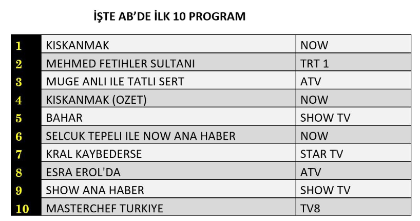 Aynı gün Total izleyici grubunda üçüncü, ABC1 kategorisinde ise ikinci sıraya yerleşen "Kıskanmak" dizisi, dramatik anlatımı ve karakter derinliği ile öne çıkarak gecenin en çok konuşulan dizilerinden biri oldu.