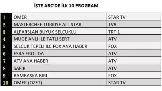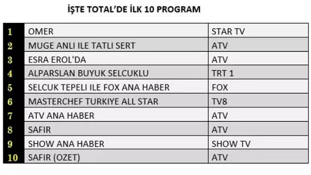 Zirvedeki Ömer'i Müge Anlı İle Tatlı Sert, Esra Erol'da, Alparslan Büyük Selçuklu, Fox Ana Haber ve Masterchef Türkiye All Star takip ediyor. ATV Ana Haber, Safir, Show Ana Haber ve Safir özeti listelere giren diğer yapımlar oldu.