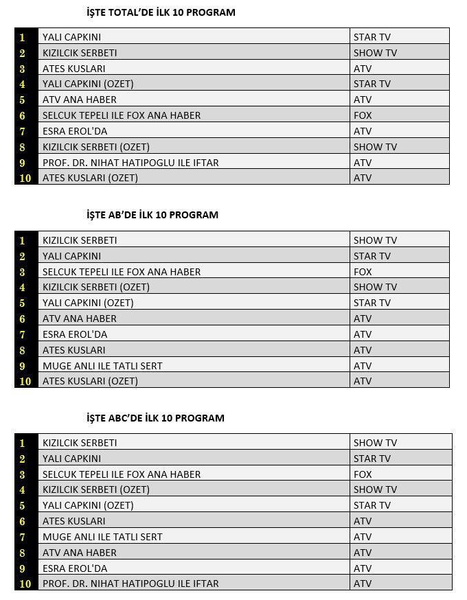Not: TİAK'ın aldığı karar nedeniyle reyting sonuçlarının detaylarını ve ilk 100 program sıralamasını yayınlayamıyoruz