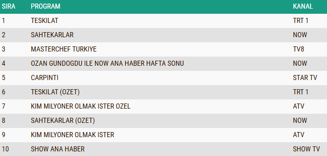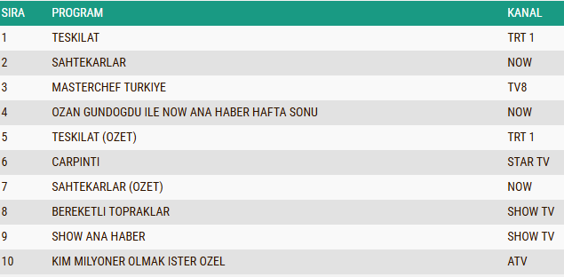 TRT 1'in fenomen dizisi Teşkilat, 9 Kasım pazar akşamı yine adından söz ettirdi. Her hafta olduğu gibi bu bölümde de izleyiciyi ekrana kilitleyen yapım, Total kategorisinde açık ara farkla birinci oldu. AB ve ABC1 gruplarında da zirvenin sahibi olan dizi, aksiyon dolu sahneleri ve duygusal anlatımıyla haftanın en çok izlenen yapımı ünvanını korudu. Dizinin özet bölümü de listelerde üst sıralarda yer alarak başarısını pekiştirdi. Konuya dair tüm detaylar haberimizde...