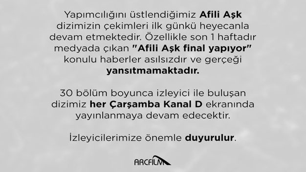 Afili Aşk’ın yapım şirketi olan ARC Film dizinin final yapacak söylentilerini bitirmek için bir açıklama yaptı. Açıklamada şu ifadelere yer verildi: “Yapımcılığını üstlendiğimiz Afili Aşk dizinizin çekimleri ilk günkü heyecanla devam etmektedir. Özellikle son bir haftadır medyada çıkan “Afili Aşk final yapıyor” konulu haberler asılsızdır ve gerçeği yansıtmamaktadır. 30 Bölüm boyunca izleyici ile buluşan dizimiz her Çarşamba Kanal D ekranında yayınlanmaya devam edecektir. İzleyicilerimize önemle duyurulur.” Bu açıklamayla Afili Aşk’ın en azından şimdilik final yapmayacağı belli olmuş oldu. Peki, bu final söylentileri neden ortaya çıktı? Dizi yaz sezonunda başlamış ve reytinglerinin iyi olması sebebiyle devam etmesine karar verilmişti. Reytingleri belli bir oranda devam eden dizinin reytingleri yılbaşından önceki birkaç bölümde düşmeye başlamıştı. Yılbaşı arasında diziye yapılan müdahaleler de reytingleri düzeltemeyince final yapacak söylentileri iyice konuşulmaya başlanmıştı. ARC Filmin açıklamasıyla şimdilik bu söylenti bitmiş oldu.