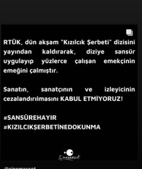 RTÜK tarafından 5 bölüm yayın kesme cezası ile cezalandırılan Kızılcık Şerbeti bir türlü gündemden düşmüyor. Dizinin önceki bölümlerinde Nursema karakterine gerdek gecesi yapılan şiddet sahnelerinden dolayı hakkında soruşturma başlatılan ve 5 hafta gibi uzun süre bir ceza verilen Kızılcık Şerbeti tüm sanat camiası tarafından ilk günden beri destek görüyor. Kendi ekibi dışında da rakip dizilerden destek gören Show Tv'nin dram ve aile dizisi Kzılcık Şerbeti'ne en büyük destek Yalı Çapkını dizisi yönetmeni ve oyuncusu Afra Saraçoğlu'ndan geldi.