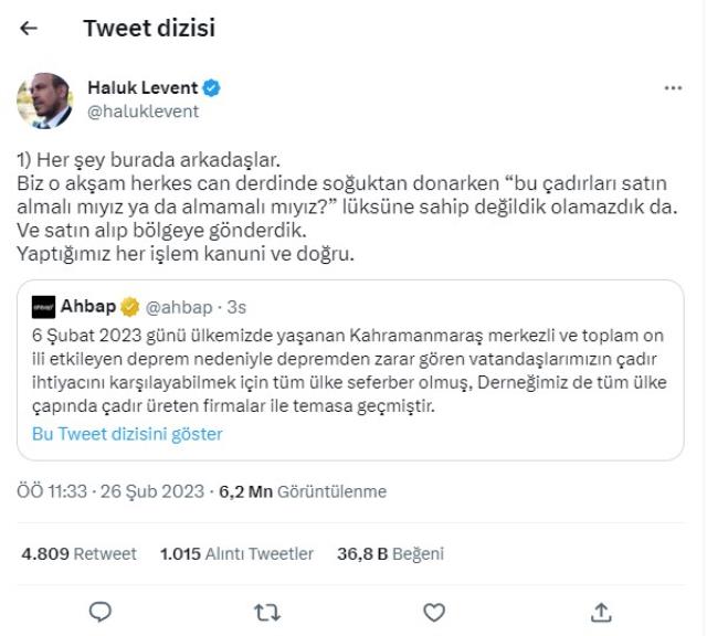 Konuyla ilgili konuşan Ahbab Başkanı Haluk Levent :"Yaptığımız her işlem kanuni ve doğru.Sonra öğrendik.Kızılay Çadır ve Tekstil A.Ş. Kızılay'ın alt iştiraki olan tüzel kişilikmiş.Kızılay da bu şirketten çadırları faturalı satın alıyorlarmış.Ahbap da aynı yöntemle toplanan bağışlarla bu şirketten satın alma gerçekleştirmişti.Zaten sitelerinde açıklama bulunuyor"dedi..jpg)