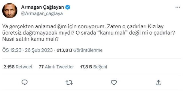 Armağan Çağlayan,"Ya gerçekten anlamadığım için soruyorum.Zaten o çadırları Kızılay ücretsiz dağıtmayacak mıydı?O sırada "kamu malı" değil mi o çadırlar?Nasıl satılır kamu malı?"paylaşımını yaptı..jpg)