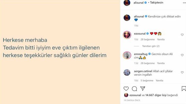 Ünlü oyuncu Ali Sunal geçtiğimiz günlerde koronavirüse yakalanmış ve ardından da kendisini karantinaya alarak tedavisine başlanmıştı. Ancak ünlü ismin durumunun ağırlaşması üzerine hastaneye kaldırıldığı haberleri bir anda ünlü ismin sevenlerini derin bir üzüntüye sevk etmişti. Bunun üzerine ünlü isim Ali Sunal sosyal medya hesabından durumuyla ilgili bir paylaşımda bulundu. Ali Sunal yaptığı paylaşımda “herkese merhaba. Tedavim bitti. İyiyim, eve çıktım. İlgilenen herkese teşekkürler. Sağlıklı günler dilerim” ifadelerini kullandı. Bu haberin duyulmasıyla ünlü ismin hayranları derin bir nefes aldı.