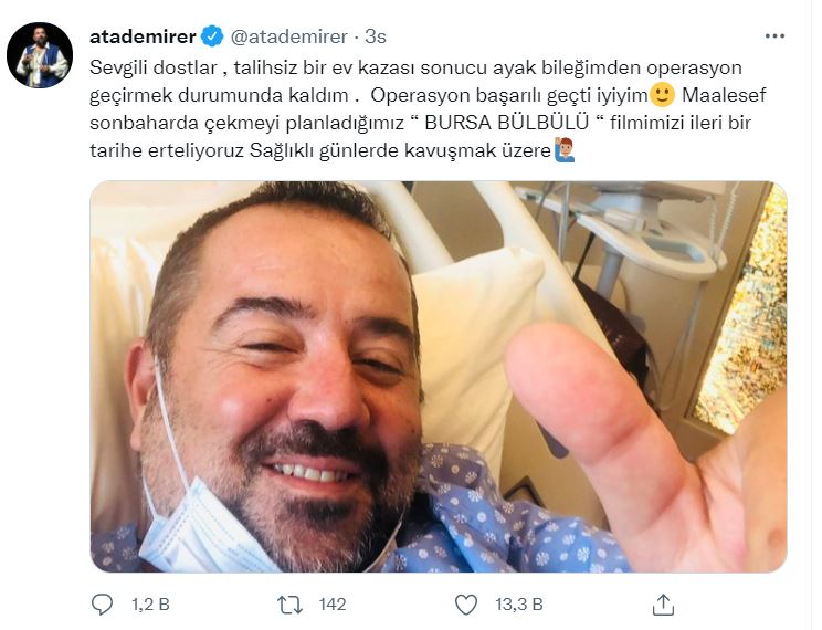 Ünlü komedyen ve oyuncu Ata Demirer'den kötü bir haber geldi. Ev kazasında yaralanan Ata Demirer hastaneye kaldırıldı. Ünlü oyuncu Demirer ayak bileğinden bir operasyon geçirdi. Sosyal medya hesbından bir paylaşım yapan Ata Demirer durumu takipçileriyle paylaştı. Sevilen oyuncunun hastane odasından yaptığı paylaşım sevenlerini endişelendirdi. Ata Demirer sonbaharda çekmeyi planladığı Bursa Bülbülü adlı filmini de ertelediğini duyurdu. Ata Demirer'in hastane odasından yaptığı sosyal medya paylaşımına çok sayıda yorum yapıldı ve geçmiş olsun dilekleri iletildi.