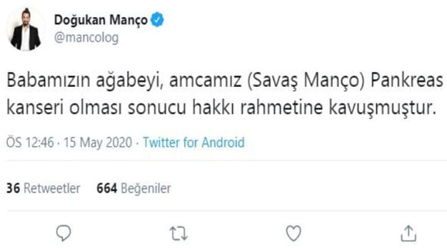 Ünlü sanatçı Barış Manço’nun Belçika’da yaşayan kardeşi Savaş Manço hayatını kaybetti. Son dakika haberi olarak gelişen olayı Sanatçı Barış Manço’nun oğlu şarkıcı Doğukan Manço sosyal hesabından yaptığı paylaşımla duyurdu. Doğukan Manço yaptığı paylaşımda “Babamızın kardeşi, amcamız (Savaş Manço) pankreas kanseri olması sonucu hakkın rahmetine kavuşmuştur” ifadelerini kullandı. 1999 yılında kalp krizi sonucu hayata veda eden Anadolu Rock Müziğinin efsane ismi Barış Manço’nun kardeşi uzun yıllardır Belçika’da yaşıyordu ve bir süredir pankreas kanseri sebebiyle tedavi görüyordu. Doğukan Manço’nun sosyal medya hesabından duyurduğu bu acı haberin ardından pek çok seveni sanatçı Barış Manço’nun kardeşi Savaş Manço’nun kaybı için sosyal medya hesaplarından üzüntülerini dile getiren paylaşımlarda bulundular. Manço ailesini de derinden üzen bu kayıp sosyal medyada ve magazin dünyasında bir anda kendine yer buldu.