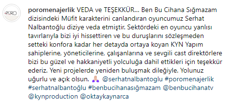 Öye yandan Nalbantoğlu'nun menajerliğini yapmakta olan Poro Menajerlik sosyal medya hesabından veda ve teşekkür mesajı yayımladı ve KYN Yapım çalışanlarına teşekkür etti.