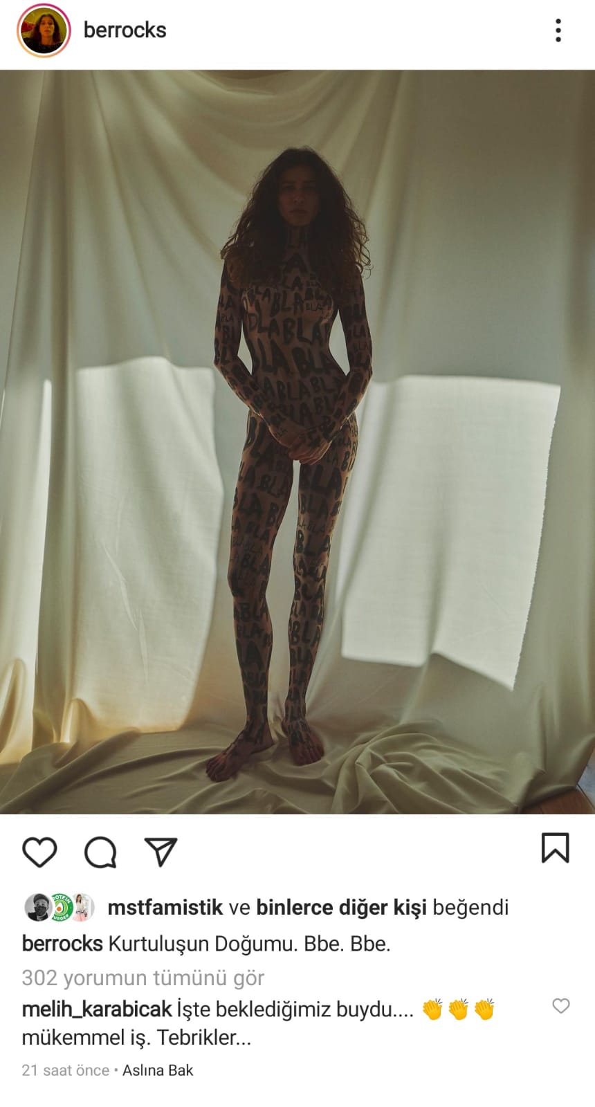 Ünlü Oyuncu ve sunucu Berrak Tüzünataç kısa süre içinde yeniden gündem oldu. Sosyal medya hesabından paylaştığı fotoğraflara tepki yağdı. Daha önce yüzünden göğüs üstüne kadar Bla Bala yazarak fotoğraflarını paylaşan ünlü oyuncu, bu kez gündem olacak bambaşka bir paylaşımile tepkilere konu oldu. Yorumlarda Berrak Tüzünataç'ın takipçileri onay verirken bir grup saçma bulduğunu, türkçe kelimeler ile ifade etmesi gerektiğini söylerken Berrak Tüzünataç, fotoğraflarının altına ingilizce açıklamada bulundu.