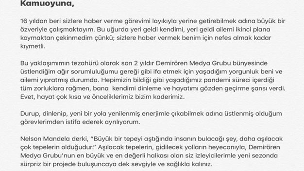 16 yıldır televizyonlarda muhabir, sunucu ve ana haber sunucusu olarak görev yapan ve son 2 senedir de kanal d Ana haber’in sunuculuğunu üstlenen Buket Aydın bugün sosyal medya hesabından yaptığı bir paylaşımla Kanal D’den istifa ettiğini açıkladı. Buket Aydın sosyal medya hesabından yaptığı paylaşımda “16 yıldan beri size haber verme görevimi layığıyla yerine getirebilmek adına büyük bir özveriyle çalışmaktayım. Bu yaklaşımın tezahürü olarak son 2 yıldır Demirören Medya Grubu bünyesinde üstlendiğim ağır sorumluluğumu gereği gibi ifa etmek için yaşadığım yorgunluk beni ve ailemi yıpratmış durumda. Durup dinlenip, yeni bir yola yenilenmiş enerjimle çıkabilmek adına üstlendiğim görevimden istifa ederek ayrılıyorum” ifadelerini kullandı. Böylece Buket Aydın’la Kanal D Ana Haber’de bir devir kapandı. Zaman zaman eleştirilere hedef olan ve kovulduğu, istifa ettiği şeklinde haberlerin çıktığı Buket Aydın bu sefer kesin olarak Kanal D Haber ev Kanal D ile yollarını ayırmış oldu.