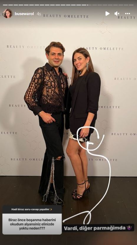 Alişan ve Buse Varol çiftinin iddiaları yalanlamasının ardından kapanan konu Buse Varol'un son paylaşımıyla yeniden konuşulmaya başlandı. Buse Varol'un son yaptığı paylaşımda alyans ve tektaş kullanmaması iddiları yeniden gündeme getirdi. Varol dün gece katıldığı bir programdan fotoğraflar paylaştı. Fotoğraflarda yalnız olan Varol'un parkmaklarında evlilik yüzüğünün olmaması dikkatlerden kaçmadı. Sosyal medya hesabından takipçilerinin sorularını cevaplayan Buse Varol yeni iddiaları da yalanlamış oldu. Buse Varol'a "Neden sürekli boşanma haberleri geliyor" sorusu soruldu. Varol bu soruya, "Keşke biz de anlasak" cevabını verdi. Öte yandan parmağında alyansını olmadığı iddiasını da Buse Varol bir fotoğraf paylaşımıyla yanıtladı. İşte o fotoğraf;