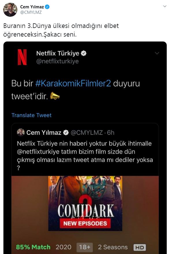 Netflix Türkiye, Cem Yılmaz'ın paylaşımını alıntıladığı tweet'e, "Bu bir Karakomik Filmler 2 duyuru tweet'idir" notunu yazdı. Cem Yılmaz da bu tweet'e cevap olarak, "Buranın 3. Dünya ülkesi olmadığını elbet öğreneceksin. Şakacı seni" paylaşımında bulundu. Netflix Türkiye'nin kurumsal sosyal medya hesabıyla, Cem Yılmaz'ın girdiği ilginç diyaloga beğeni ve yorum yağdı. Ve paylaşımlar binlerce retweet aldı. Cem Yılmaz'ın son filmi olan Karakomik Filmler 2 merakla bekleniyordu. Cem Yılmaz 26 Haziran'da filmin Netflix'te yayına başladığını duyurmuştu. Filmin duyurusunun Netflix Türkiye hesabından yapılmaması üzerine Cem Yılmaz 27 Haziran'da imalı bir tweet attı ve bu tweet'in ardından yukarıdaki diyalog yaşandı.