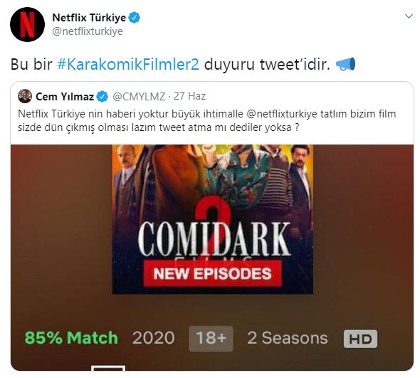 Ünlü komedyen Cem Yılmaz ile uluslararası, popüler film ve dizi platformu Netflix Türkiye arasında sosyal medyadan bir atışma yaşandı. Cem Yılmaz, Netflix platformunda gösterime giren yeni filmi Karakomik Filmler 2'nin duyurusunun yapılmamasına tepki gösterdi. Esprili bir dil kullanan Cem Yılmaz, Netflix Türkiye hesabını etiketleyerek, "Tatlım bizim film sizde dün çıkmış olması lazım tweet atma mı dediler yoksa?" notunu yazdı. Sosyal medyadan tepkisini ortaya koyan Cem Yılmaz'a Netflix Türkiye'nin hesabından cevap geldi.