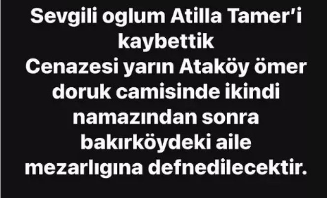 Yılların ustası, tecrübeli oyuncu Cihat Tamer 57 yaşındaki oğlunun ölümü ile sarsıldı. Aylardır kanser tedavisi gören ünlü oyuncunun oğlu Atilla Tamer tedavi gördüğü hastanede yaşama gözlerini kapadı. "Sevgili oğlum Atilla Tamer'i kaybettik. Cenazesi yarın Ataköy Ömer Doruk Cami'sinde ikindi namazından sonra Bakırköy'deki aile mezarlığına defnedilecektir" diyerek sosyal medya hesabından oğlunun vefat haberini duyuran usta oyuncu durumu ağırlaşan oğlu için kan anonsu yapmıştı.
