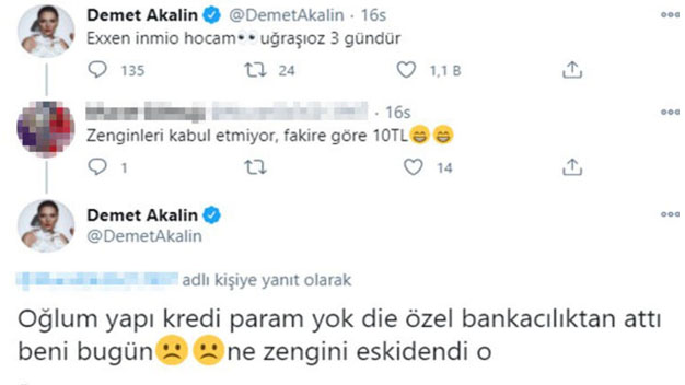 Ünlü şarkıcı Demet Akalın geçtiğimiz günlerde sosyal medya hesabından bir paylaşımda bulunarak parası olmadığını dile getirdi. Ünlü ismin yeni internet yayın platformu Exxen’i indirmek istediği ve bunun nasıl olacağına dair bir paylaşımda bulundu. Bunun üzerine ünlü isme bir takipçisi cevap verdi ve “zenginleri kabul etmiyor” diyerek yorumda bulundu. Bunun üzerine ünlü ismin takipçisine verdiği cevap bir anda magazin basını ve sosyal medyada olay oldu. Demet Akalın verdiği cevapta “oğlum banka param yok diye özel bankacılıktan attı beni bugün. Ne zengini eskidendi o” ifadelerini kullandı. Bu cevap bir anda gündem olurken daha önce kullandığı “ben bile geçinemiyorum” ifadeleri kadar çok konuşulacak gibi görünüyor.