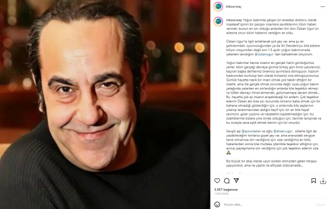 1,5 aydır tedavi gördüğü yoğun bakımda cumartesi günü hayata veda eden ünlü sanatçı Özkan Uğur’un doktoru Aylin İlksöz sosyal medya hesabından Ünlü şarkıcının son günlerini anlattı;"Yoğun bakımda çalışan bir anestezi doktoru olarak maalesef işimin bir parçası insanlara sevdiklerinin ölüm haberi vermek, bunun en zor olduğu anlardan biri Özkan Uğur'un ailesine onun ölüm haberini verdiğim an oldu. Özkan Uğur'la ilgili anlatılacak çok şey var, ama şu an şarkılarından, oyunculuğundan ya da Ali Desidero'yu bile ezbere biliyor oluşumdan değil son 1.5 aydır yoğun bakımımızda yatarken tanıdığım Özkan Uğur'dan bahsetmek istiyorum."