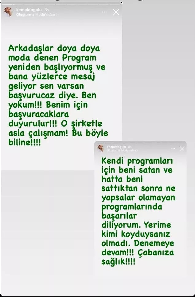 Bunun üzerine kandırıldığını düşünen Kemal Doğulu programa ve program ve kanal sahibi Acun Ilıcalı’ya ağzına geleni söyledi. Ard ardına sosyal medya hesabından yeni sezonunda başlayacağını duyan Kemal Doğulu paylaşımlar yaptı ve Asla programa dahil olmayacağını ve bu kanalla iş yapmayacağını öfkeli bir dille duyurdu. İşte paylaşımları…