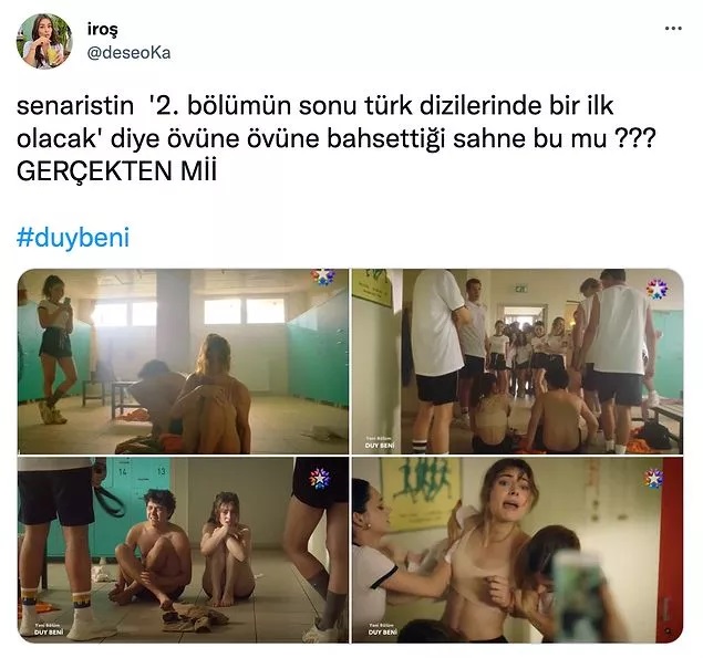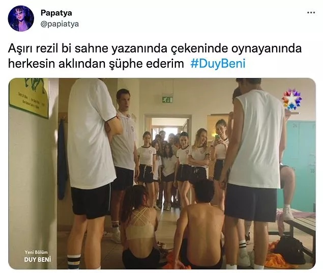 O sahneler çok konuşuldu, Duy Beni dizisinde iki lise öğrencisine arkadaşları tarafından yapılanlar izleyicileri öfkelendirdi. Star TV’de ekrana gelen Duy Beni’de, orta sınıf ailelerin çocuklarından, bursla özel okulda okuyan iki genç, kendisini okulda istemeyen diğer arkadaşları tarafından herkesin içinde soyularak kamera kaydına alındı. O şiddet dolu sahneler kısa sürede Twitter’da gündem olurken, tepkiler de beraberinde geldi. Zorbalık içeren o sahnelere kullanıcılar, ‘Çocukların bilinçaltına ne koymaya çalışıyorsunuz?’ ve ‘Senaristler ne yaptığının farkında mı?’ yorumlarında bulundu.