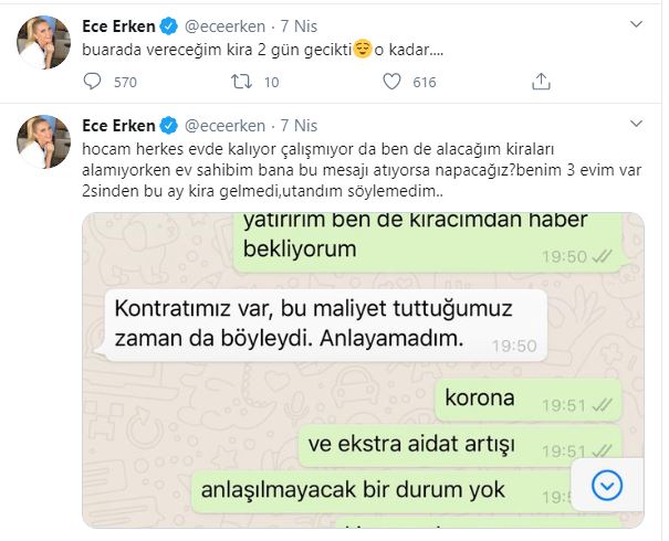 Tv programlarının ünlü sunucusu Ece Erken'in ev sahibi ile başı dertte. Sunucu Ece Erken 2 gün kirayı geciktirdiği için ödeme isteyen ev sahibine isyan etti. Ece Erken, “Herkes evde. Kimse çalışmıyor. Ben de alacağım kiraları alamazken ev sahibim bana bu mesajı atıyorsa ne yapacagız? 2'si kirada 3 evim var. Bu ay bana da kira gelmedi. Utandım söyleyemedim” dedi. Ece Erken ev sahibi ile yaptığı whatsup yazışmasının ekran görüntüsünü sosyal medya hesabından paylaştı.