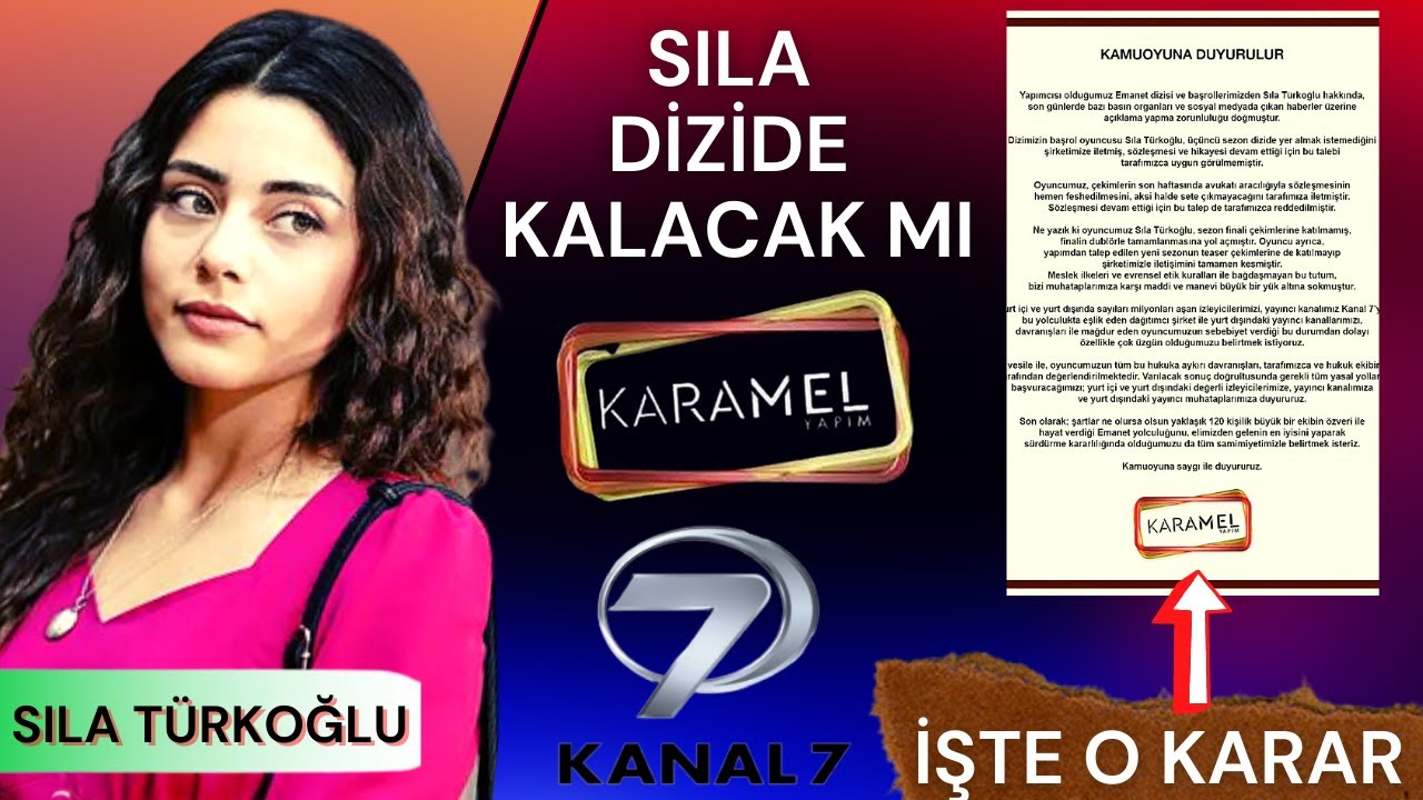 3 yıldır Kanal 7 televizyonuyla çalışan oyuncu Sıla Türkoğlu Yemin dizisiyle başladığı kariyerine 2 sezondur Emanet dizisiyle devam etti. Sevilen dizide Seher karakterine hayat veren Sıla Türkoğlu ani br kararla diziden ayrıldı. Günlerdir kendisinenden haber alınamayan genç oyuncu yapım şirketine sözleşmesini fesh etmesini bildirdi. Sıla Türkoğlu hakkında çeşitli iddialar sürerken yapım şirketi bugün bir açıklama yaptı. İşte Karamel Yapım’ın yaşananları ifşa ettiği o açıklama: "Dizimizin başrol oyuncusu Sıla Türkoğlu, üçüncü sezon dizide yer almak istemediğini şirketimize iletmiş, sözleşmesi ve hikayesi devam ettiği için bu talebi tarafımızca uygun görülmemiştir. Oyuncumuz, çekimlerin son haftasında avukatı aracılığıyla sözleşmesinin hemen feshedilmesini, aksi halde sete çıkmayacağını tarafımıza iletmiştir. Sözleşmesi devam ettiği için bu talep de tarafımızca reddedilmiştir.”
